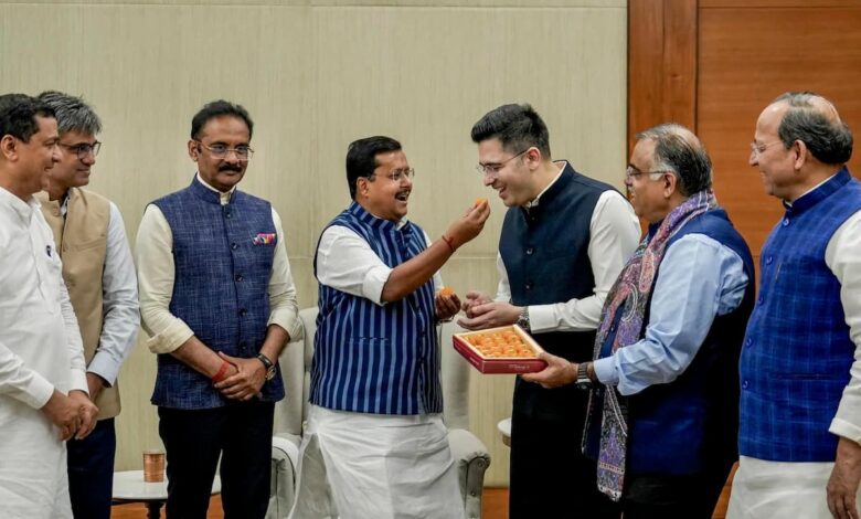आम आदमी पार्टी (AAP) से इस्तीफे के बाद राज्यसभा सांसद राघव चड्ढा (Raghav Chadha) ने भारतीय जनता पार्टी (BJP) का दामन थाम लिया। शुक्रवार को वह भाजपा के राष्ट्रीय कार्यालय पहुंचे, जहां उनकी मुलाकात भाजपा के राष्ट्रीय अध्यक्ष नितिन नबीन से हुई। इस दौरान अशोक मित्तल और संदीप पाठक भी उनके साथ मौजूद रहे। नितिन नबीन ने मिठाई खिलाकर सभी नेताओं का स्वागत किया।