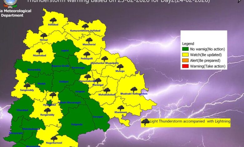 Home/News Feed/News/Thunderstorm forecast in 17 Telangana districts on February 24 News Thunderstorm forecast in 17 Telangana districts on February 24 IP News Desk Send an email February 23, 2026 Facebook X Pinterest WhatsApp Telegram Hyderabad and its surrounding districts will see a generally cloudy skyRead More IP News Desk Send an email February 23, 2026 Facebook X Pinterest WhatsApp Telegram Share Facebook X WhatsApp Telegram